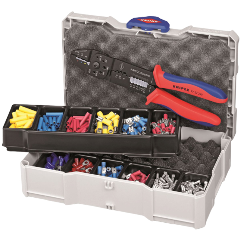Assortiments de sertissage pour raccords de câble comprenant : 25 connecteurs non isolés, 6,3x0,8 mm pour câble de 0,5-1,5 mm'b2 25 connecteurs non isolés, 6,3x0,8 mm pour câble de 1,0-2,5 mm'b2 25 cosses clips femelles, 6,3x0,8 mm pour câble de 0,5-1 mm'b2 25 cosses clips femelles, 6,3x0,8 mm pour câble de 1,5-2,5 mm'b2 25 cosses clips femelles, 6,3x0,8 mm pour câble de 4,0-6,0 mm'b2 25 cosses languette 6,3x0,8 mm pour câble de 0,5-1,0 mm'b2 25 cosses languette 6,3x0,8 mm pour câble de 1,5-2,5 mm'b2 25 cosses rondes Ø 4 mm pour câble de 0,5-1 mm'b2 25 cosses rondes Ø 4 mm pour câble de 1,5-2,5 mm'b2 25 prolongateurs isolés rouge pour câble de 0,5-1 mm'b2 25 prolongateurs isolés bleu pour câble de 1,5-2,5 mm'b2 25 prolongateurs isolés jaune pour câble de 4,0-6,0 mm'b2 livrée en coffret TANOS MINI-SYSTAINER® avec pince à sertir 97 22 240.